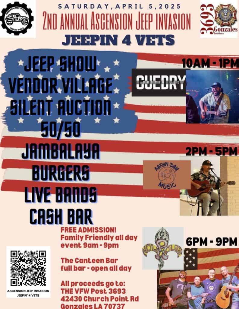 Where: VFW Post 3693 | 42430 Churchpoint Rd, Gonzales, LA