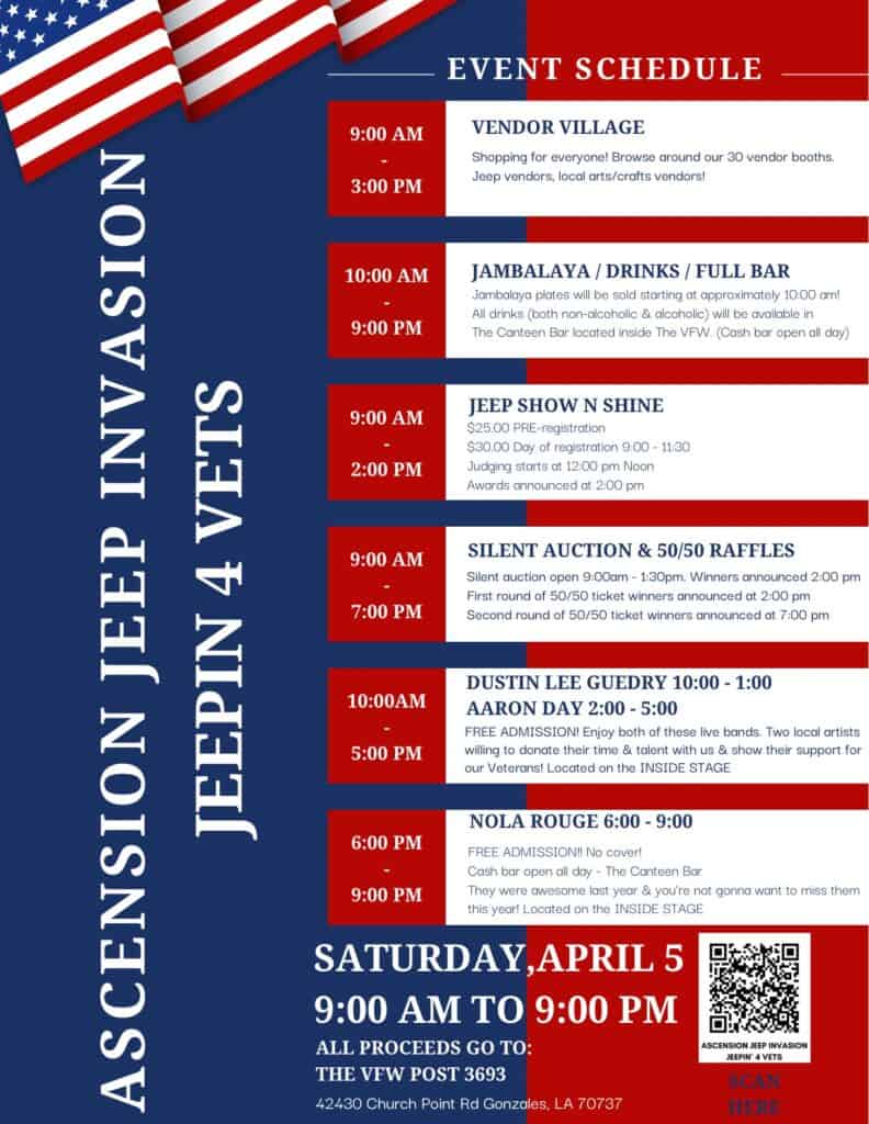 Jeep Show ‘n’ Shine, Craft & Vendors Village, 50/50 raffle, silent auction, live bands, jambalaya, and more!