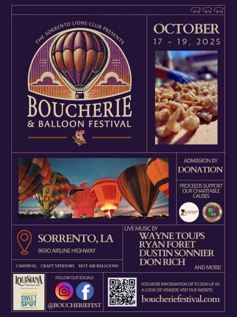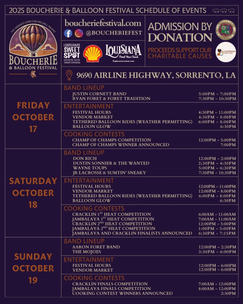 From hot air balloons and jambalaya and cracklin cookoffs, to live music and plenty of shopping, we’ve got festivities you and the family won’t want to miss.
