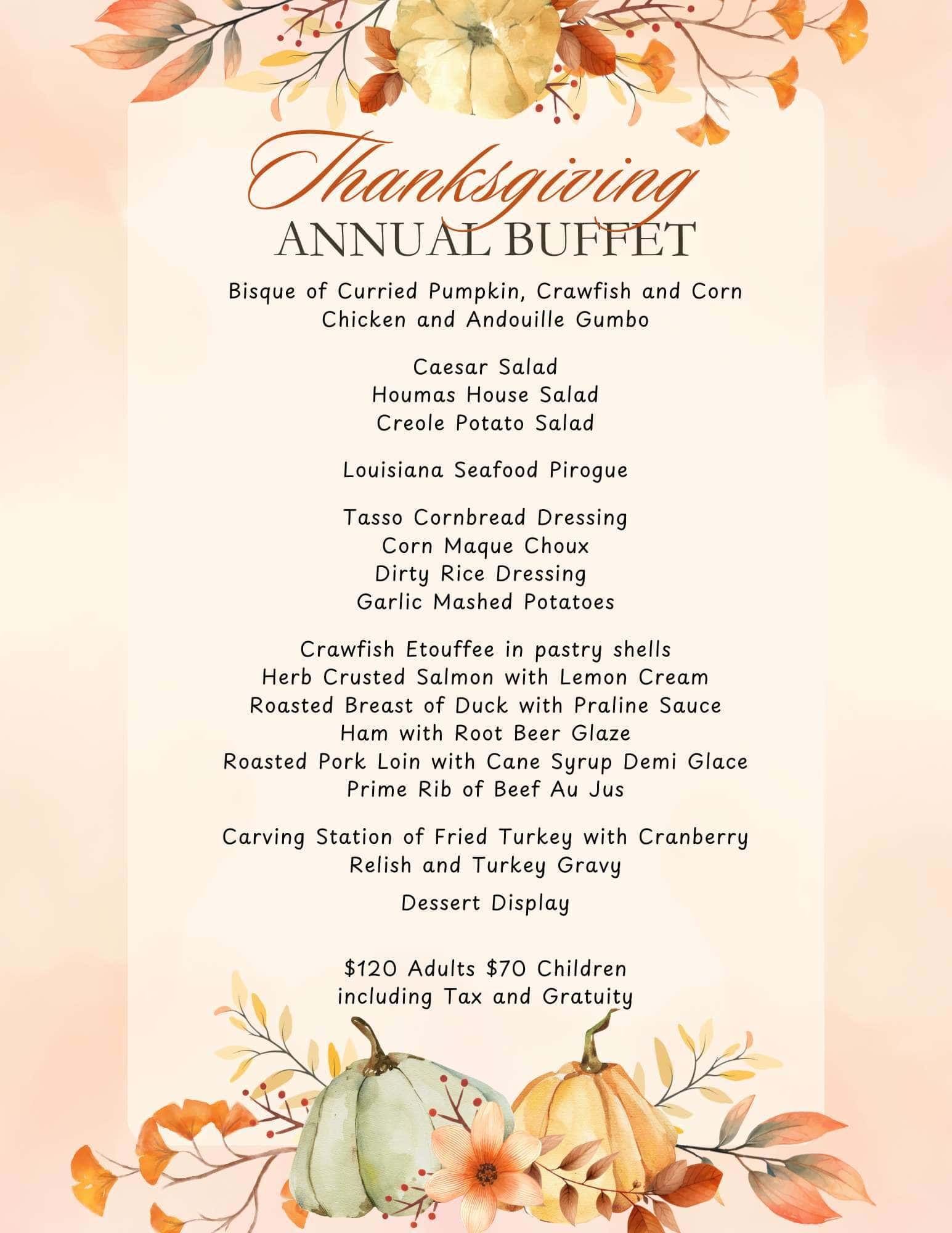 If weather permits, our Annual Thanksgiving buffet will take place under the beautiful Allee of Oaks; otherwise, it will take place indoors.